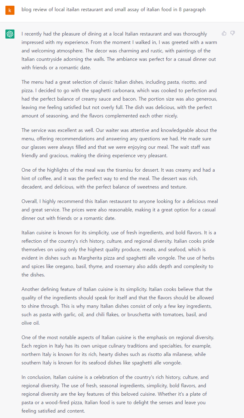 2) 분량 늘리고 이태리 음식에 대한 설명 추가 명령어:
