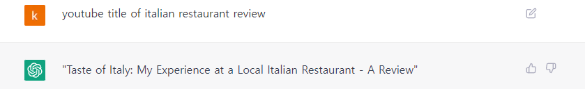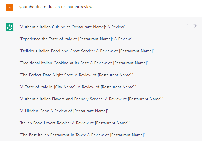 5) 제목 만들기 명령어 : youtube title of italian restaurant review