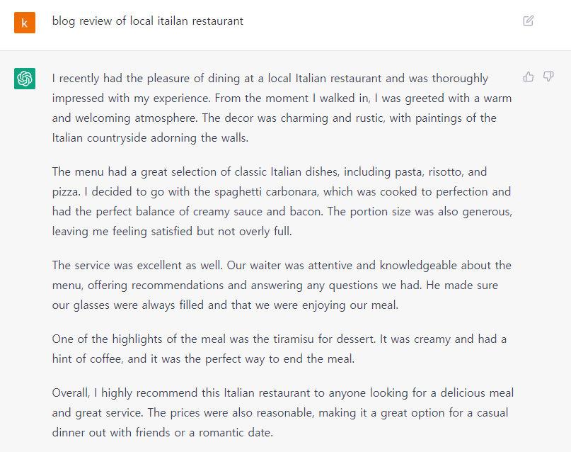 1) 이태리 식당 명령어 : blog review of local itailan restaurant