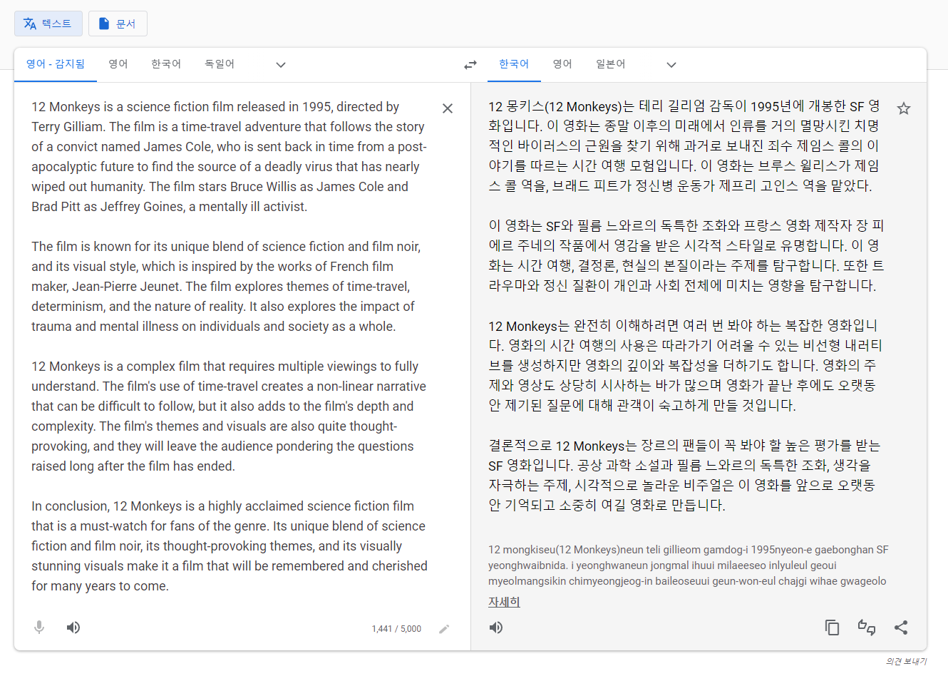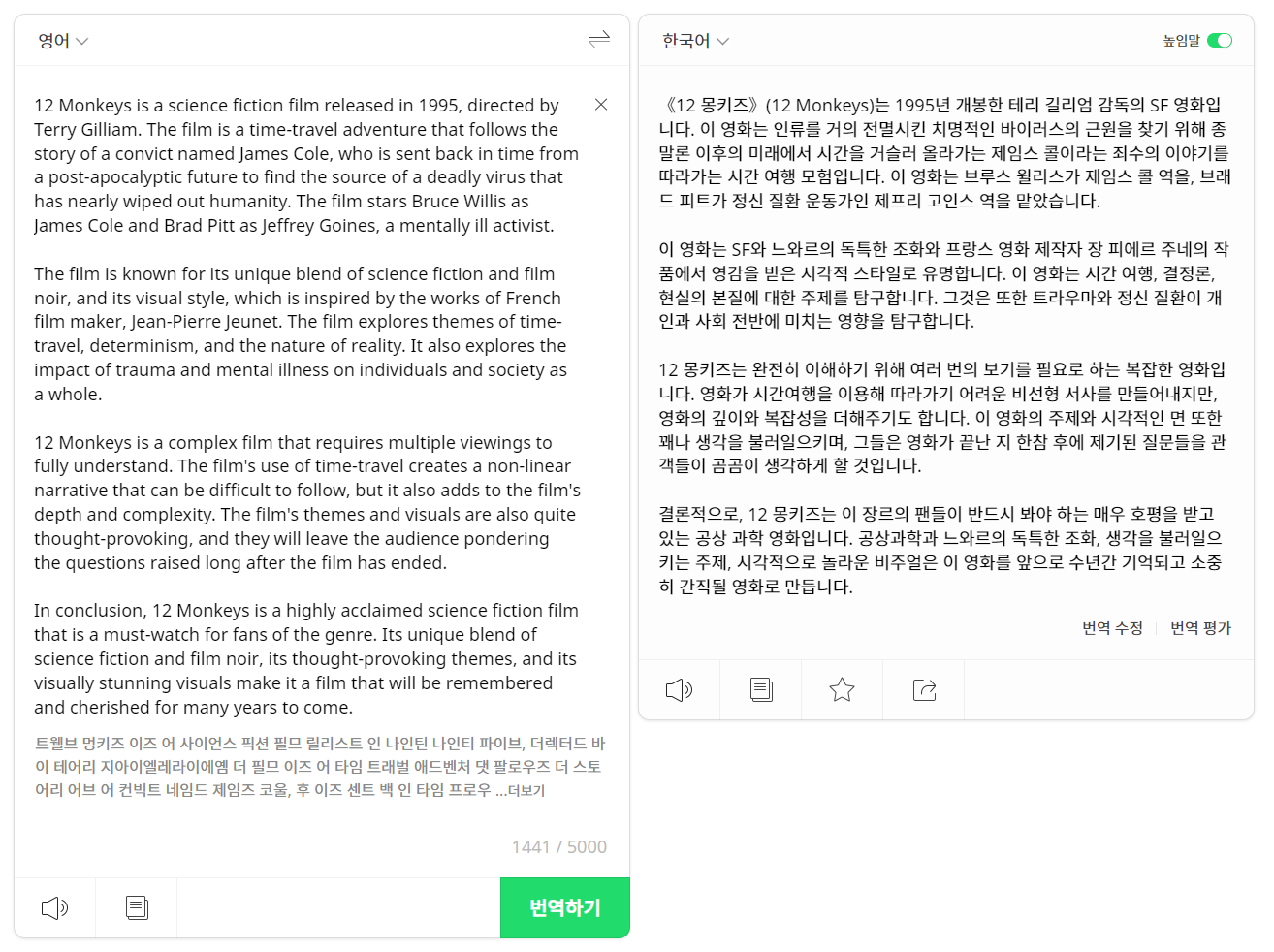 우선 'science fiction'부분을 구글은 '공상 과학 소설'로 번역했으며, 'film noir'는 파파고만 그냥 '누아르'로 번역했습니다.