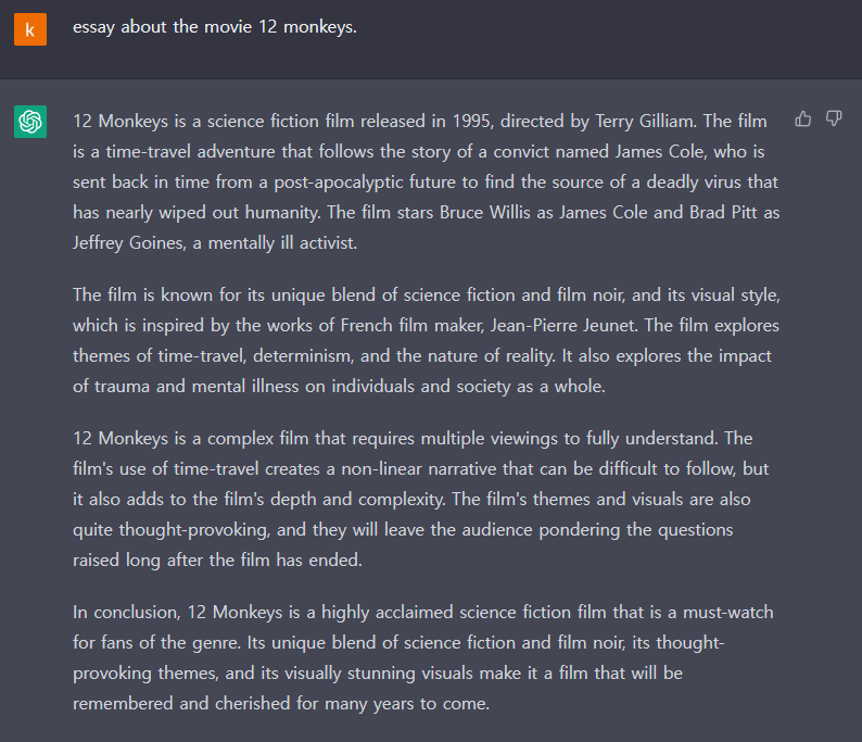 우선 chatgpt를 사용한 12몽키즈에 대한 답변 원문입니다.