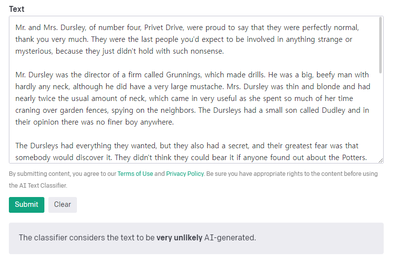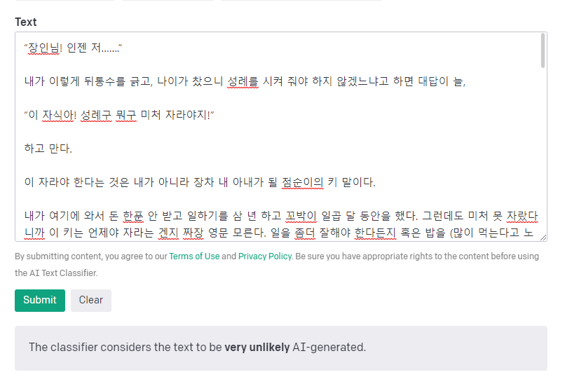 확실히 AI가 작성하지 않은 글을 넣으면 아래와 같이 나옵니다. (김유정 - 봄봄, 해리포터 입력 시)(1점)
