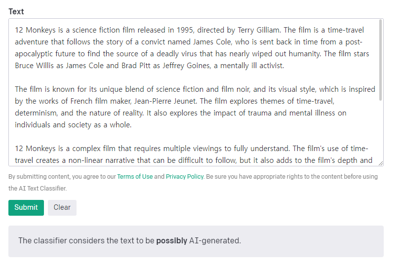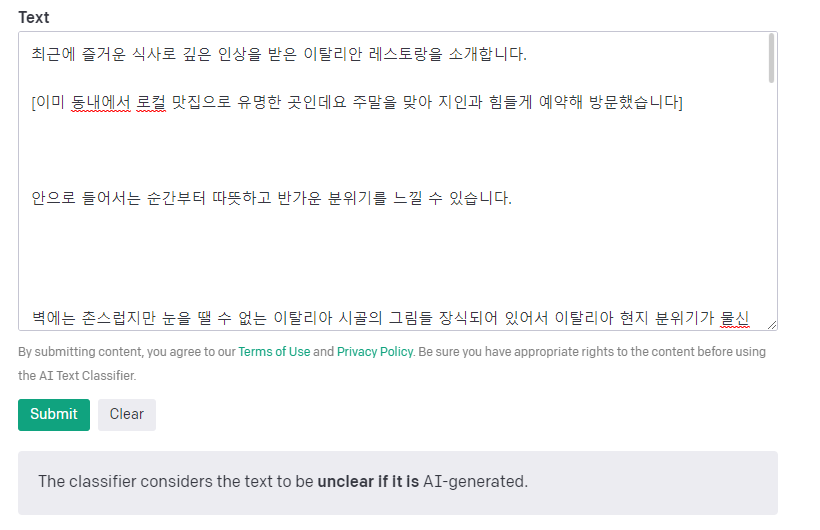 홈페이지에 의하면 classifier의 판단 방법은 classifier가 수집한 인터넷상의 사람이 작성한 자료와 openai가 생성한 ai 자료를 가지고 비교하는 방식이라고 합니다.