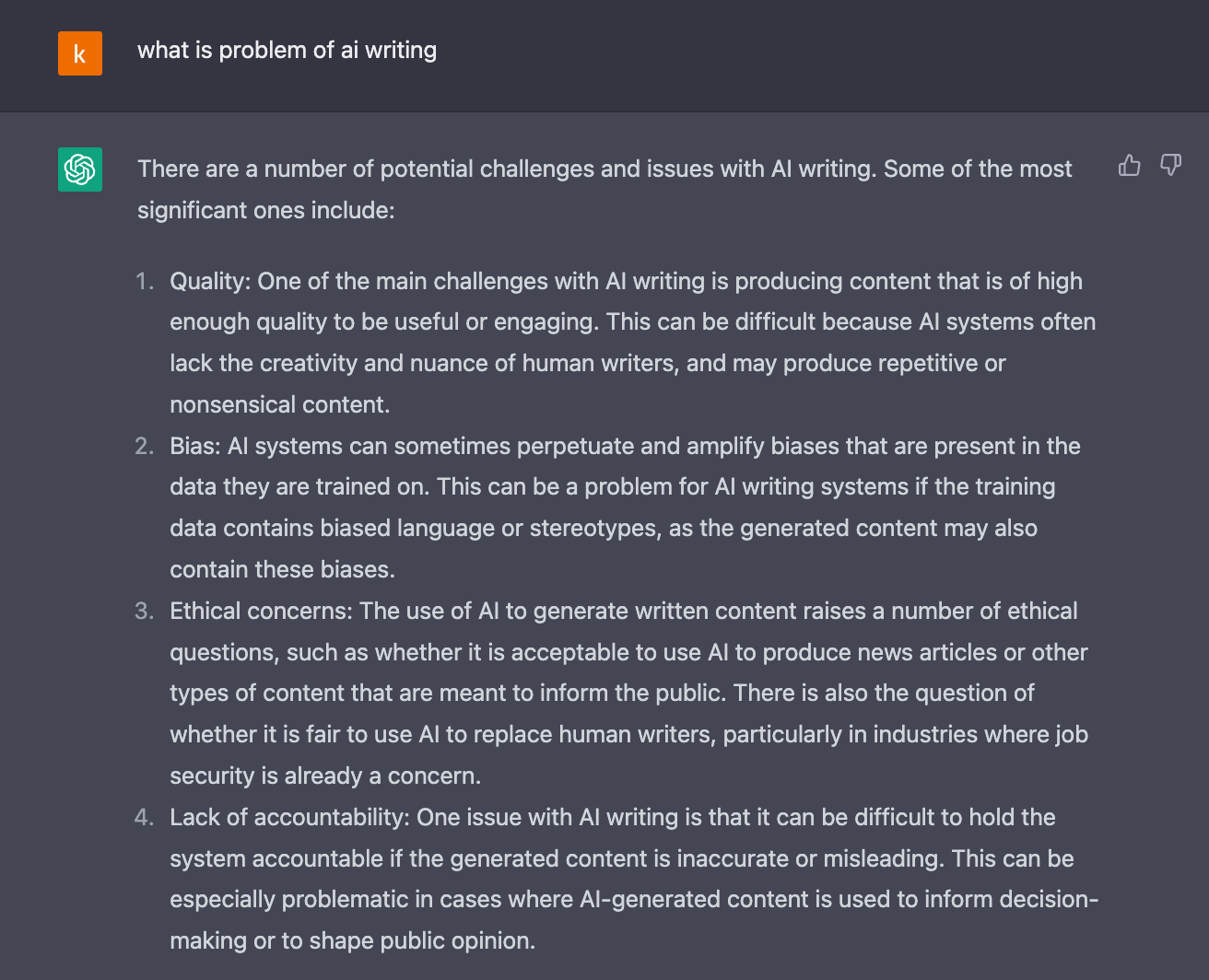 3) 윤리적 문제: 콘텐츠를 생성하기 위해 인공지능을 사용하는 것은 대중에게 알리기 위해 의도된 뉴스 기사나 다른 유형의 콘텐츠를 생산하기 위해 인공지능이 허용되는지와 같은 많은 윤리적 문제를 제기합니다. 특히 고용 안정성이 이미 우려되는 산업에서 인간 작가를 대체하기 위해 인공지능을 사용하는 것이 정당 한 지에 대한 의문도 있습니다.