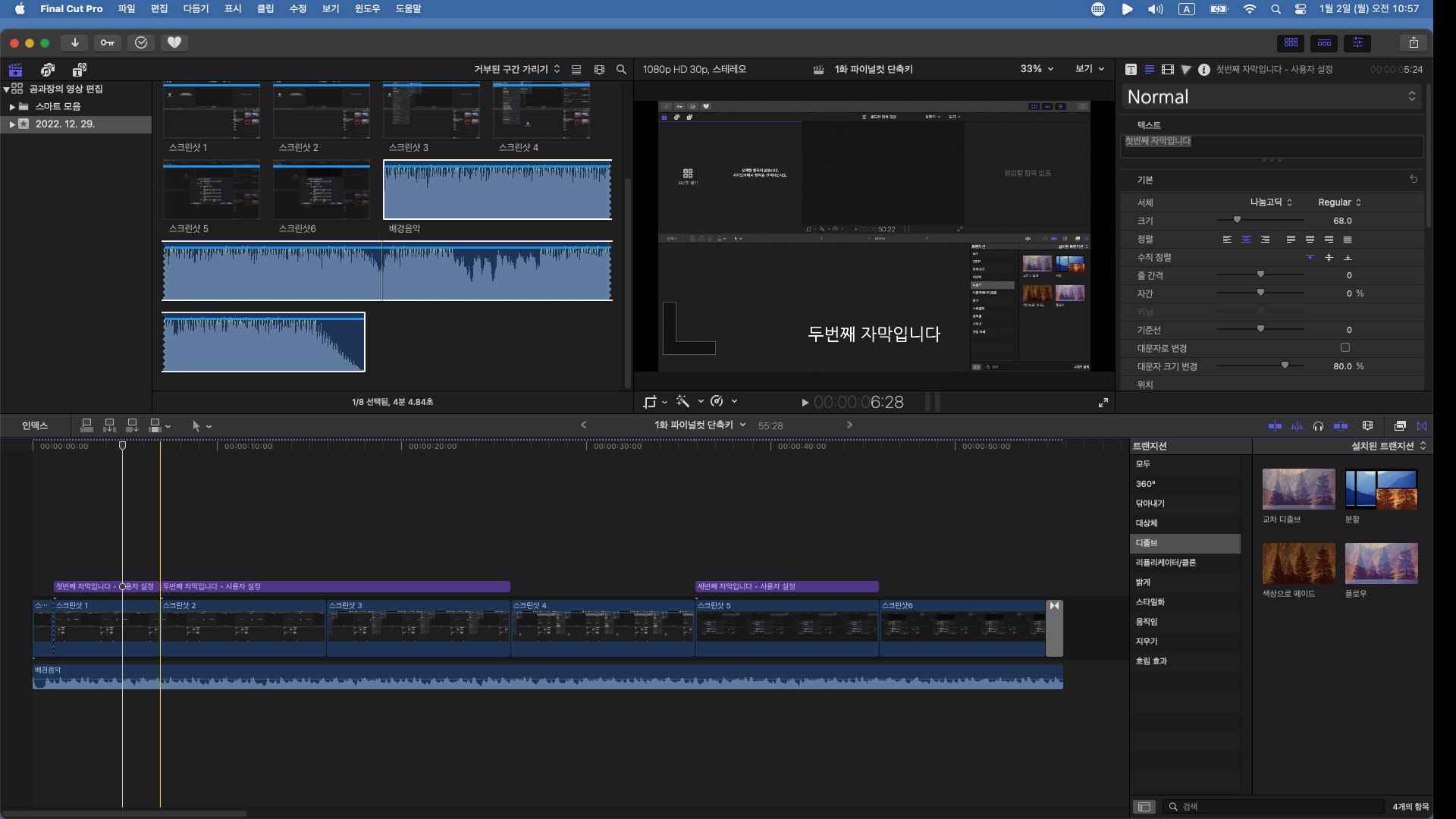 여기까지가 기본적인 파이널컷으로 영상 편집하는 방법입니다.
